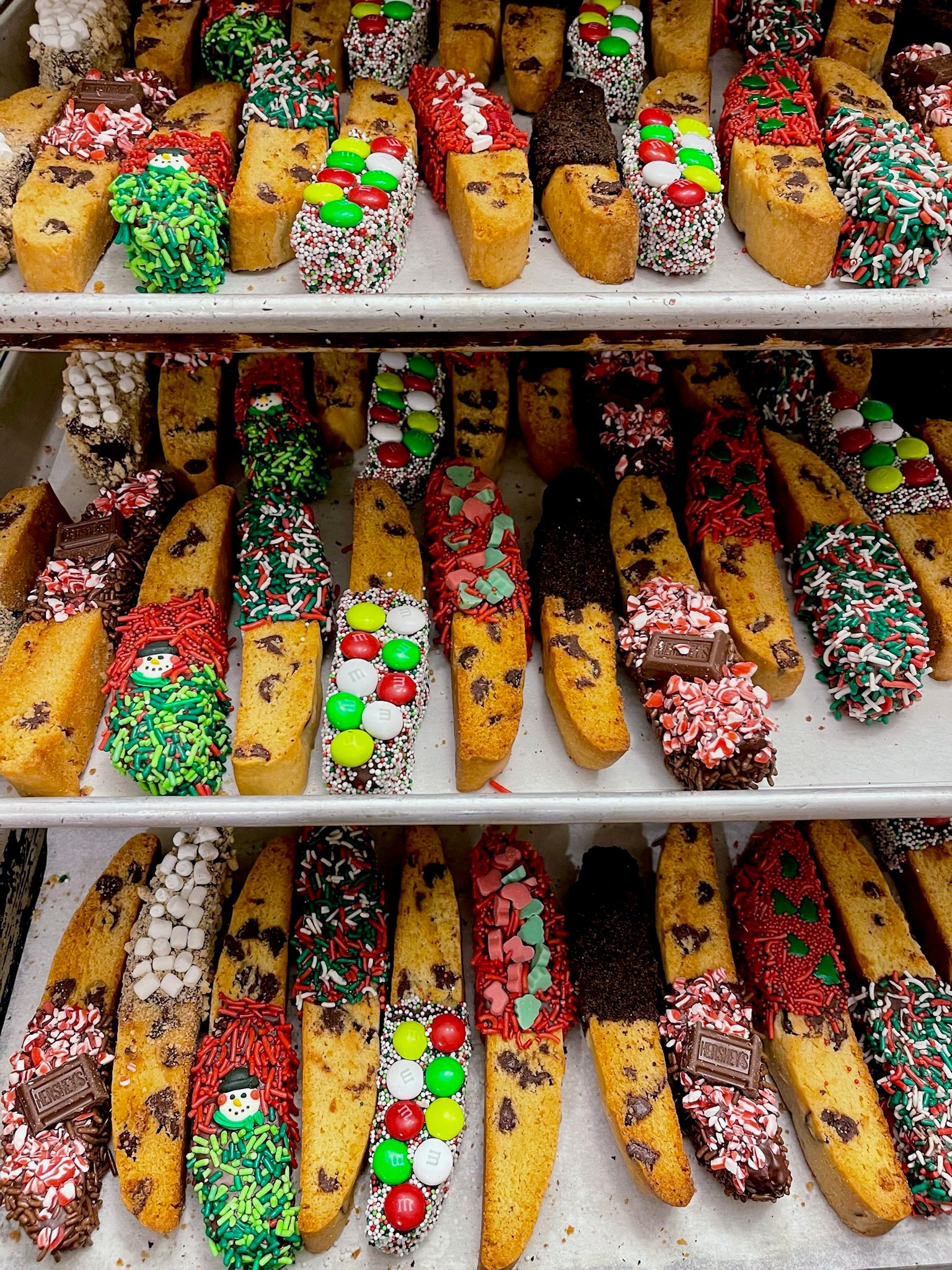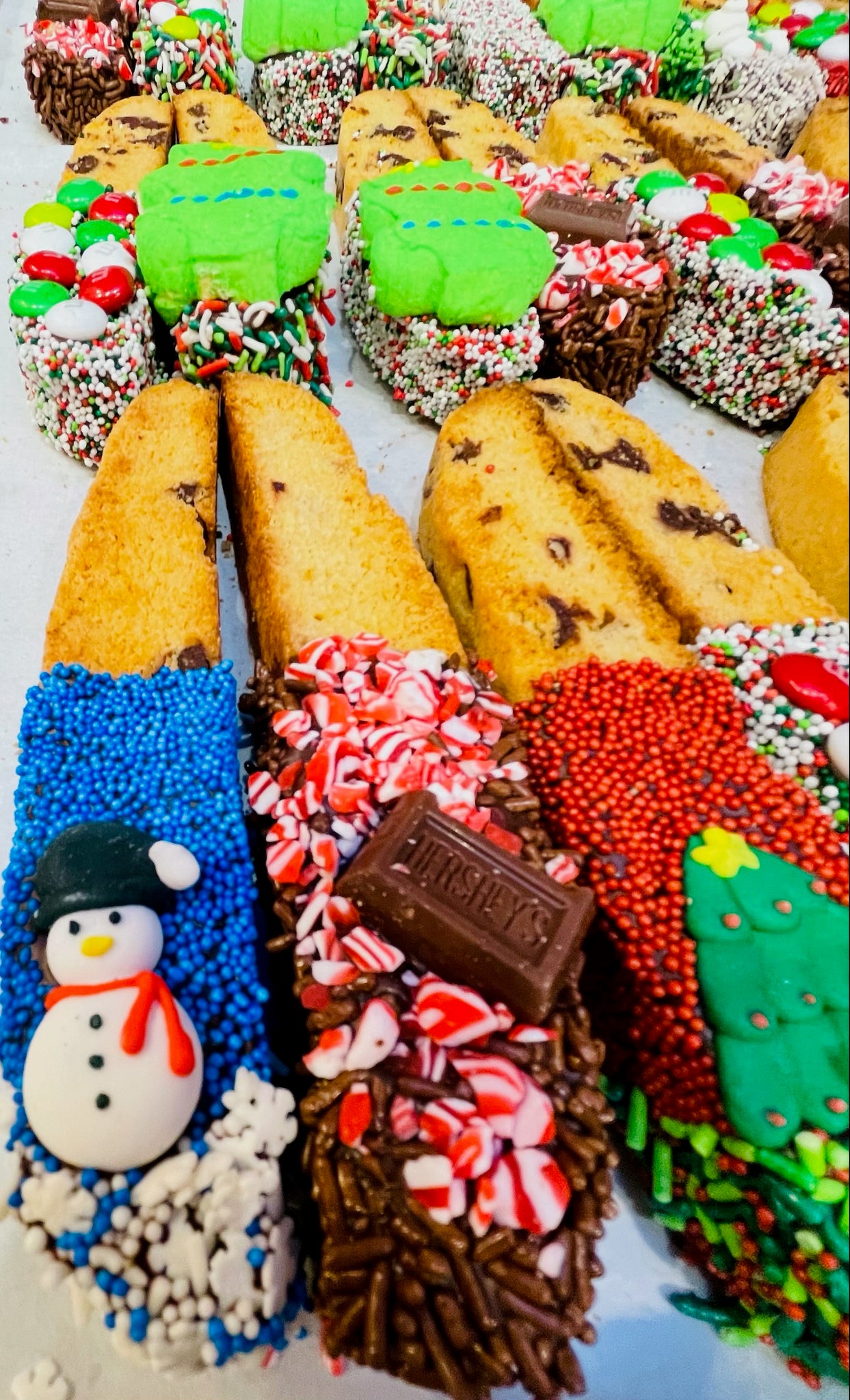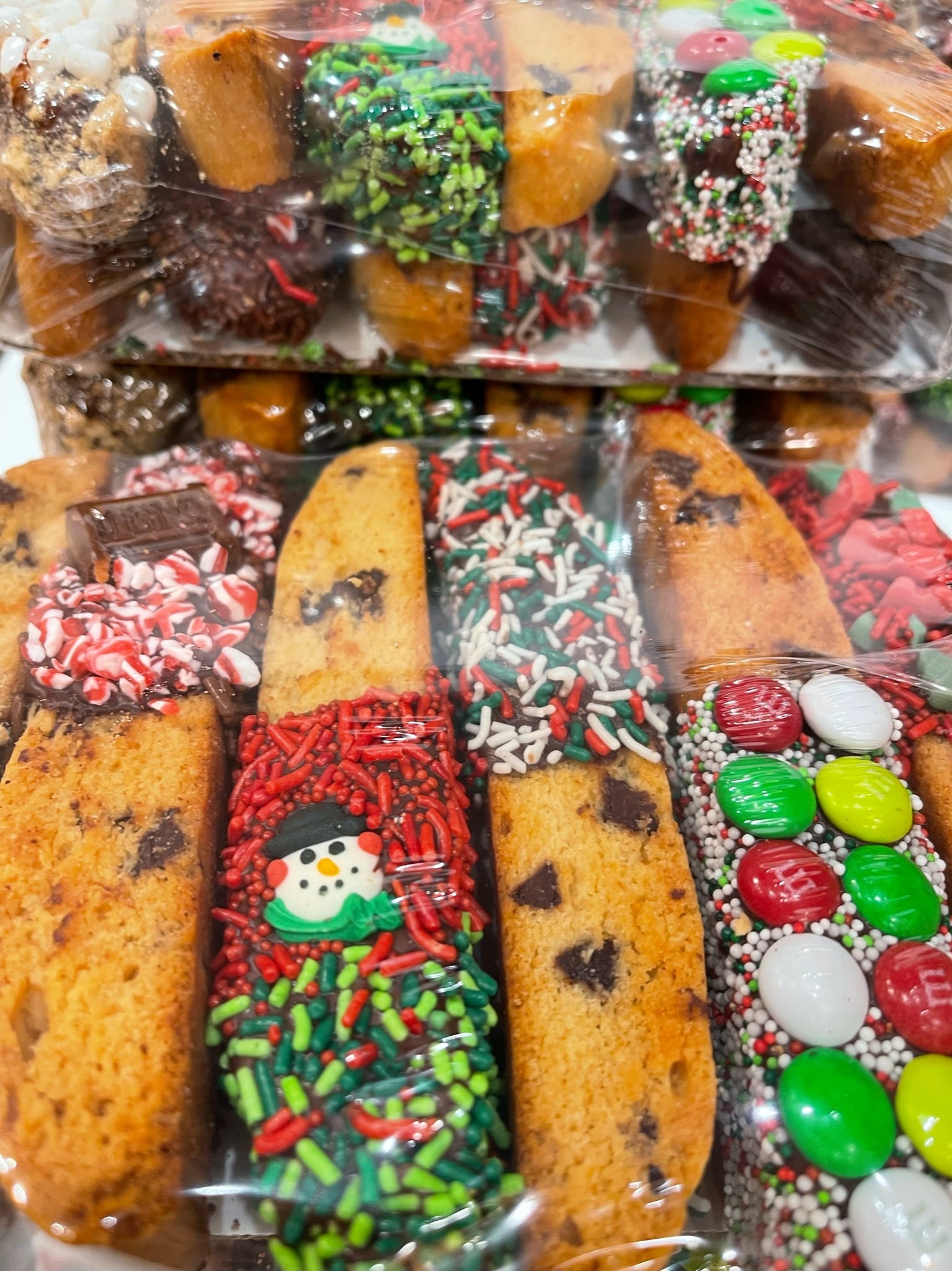Box of a Dozen Signature Chocolate Chip Biscotti enrobed in Sustainably sourced Chocolate then dipped in crazy holiday toppings!