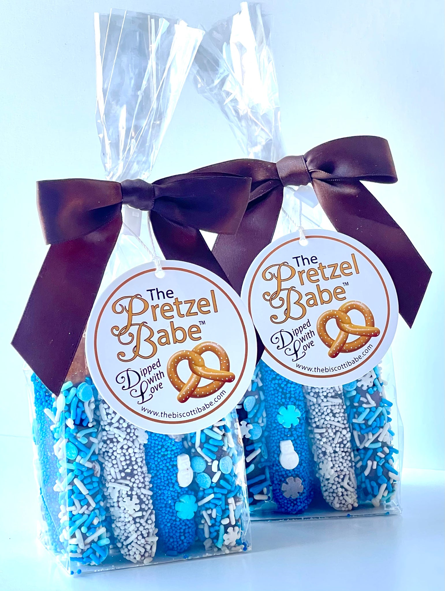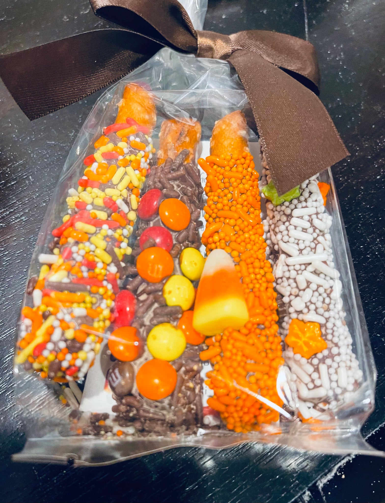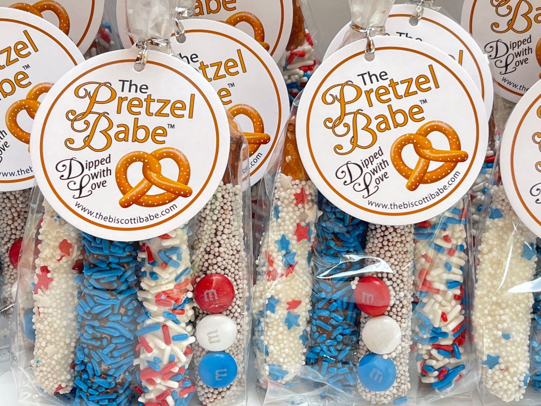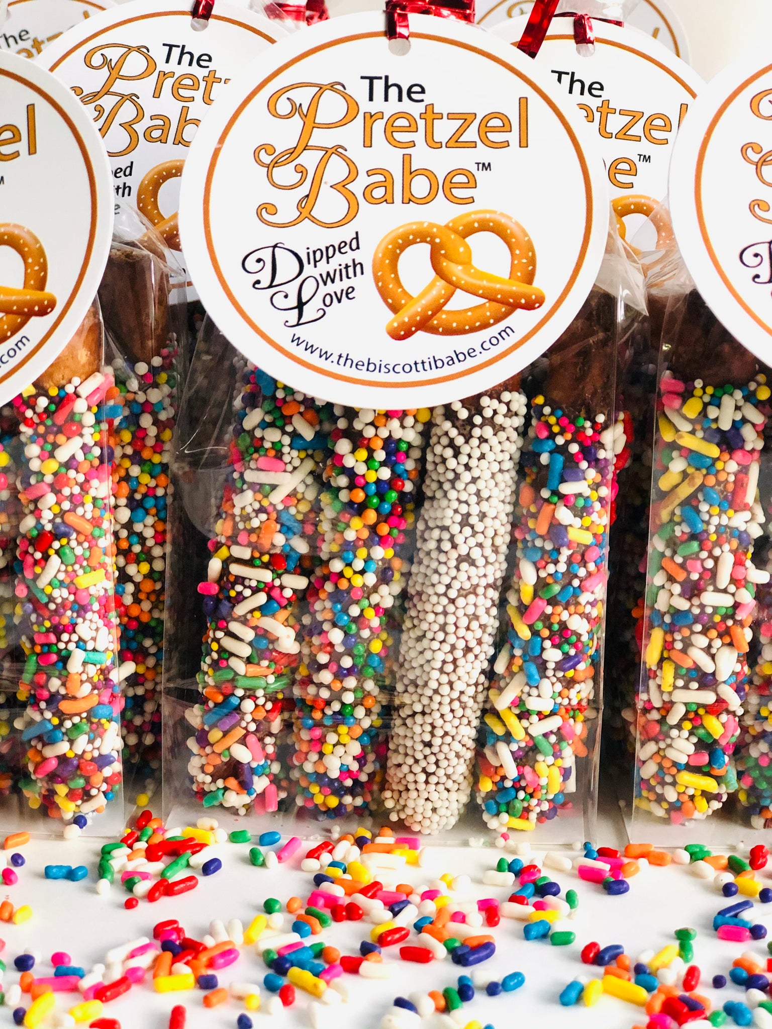 50 pack of our pretzels dipped in chocolate and decorated with an assortment of our classic toppings or specify seasonal toppings based on Holiday of your choice (Christmas, Hanukkah, Valentines Day, Easter, Mothers Day, Fatgers Day, July 4th, Halloween, Thanksgiving