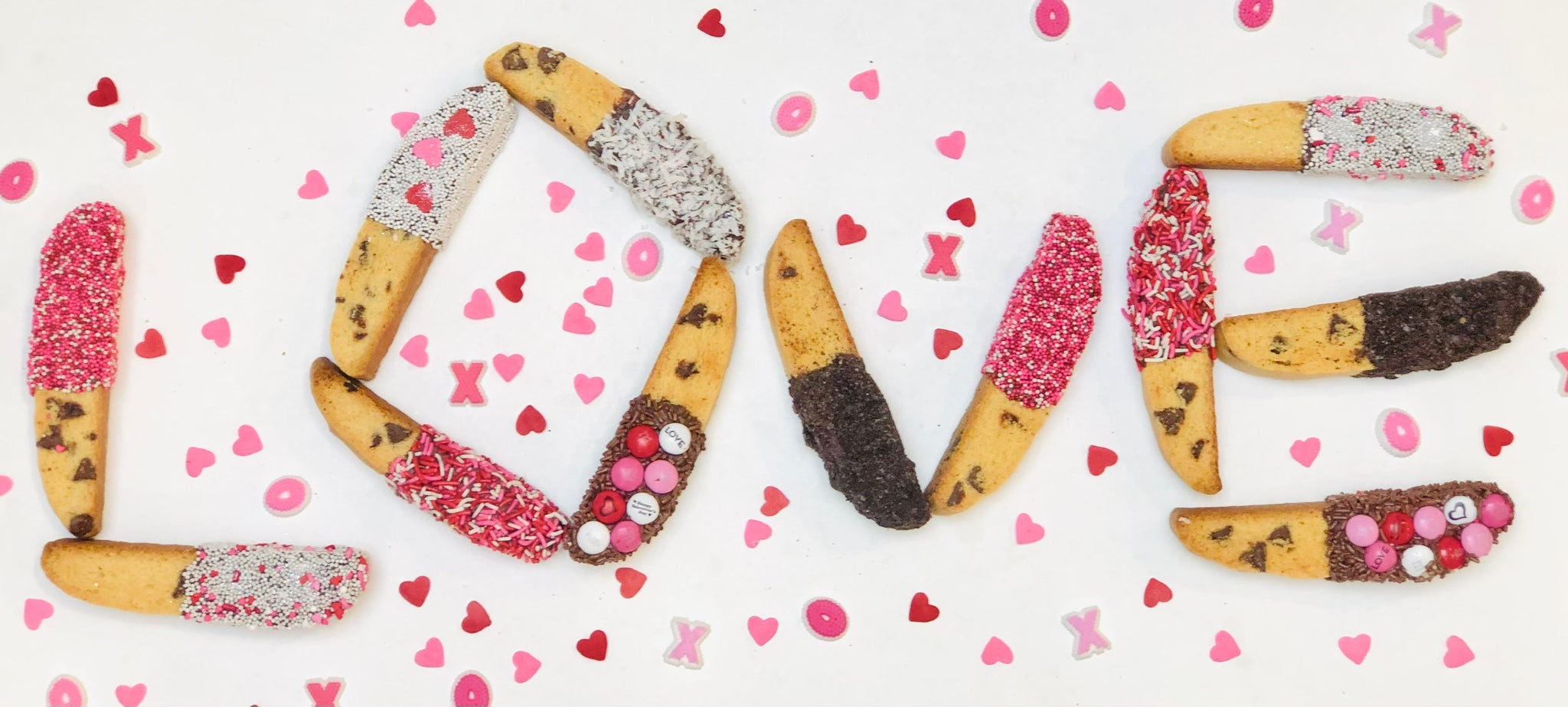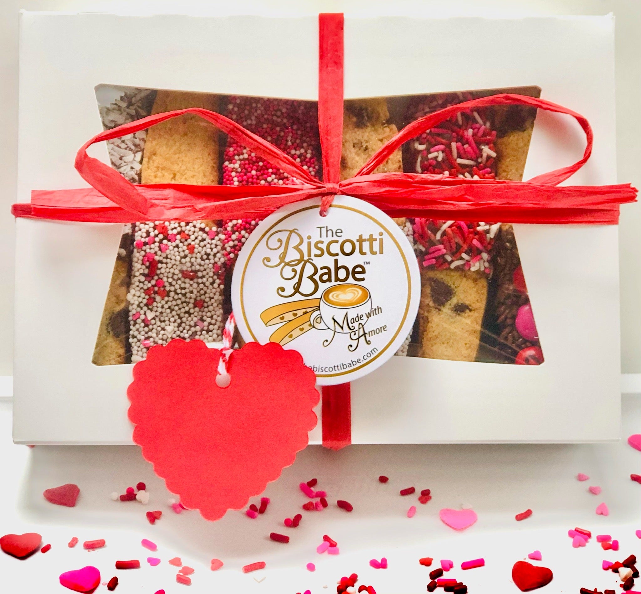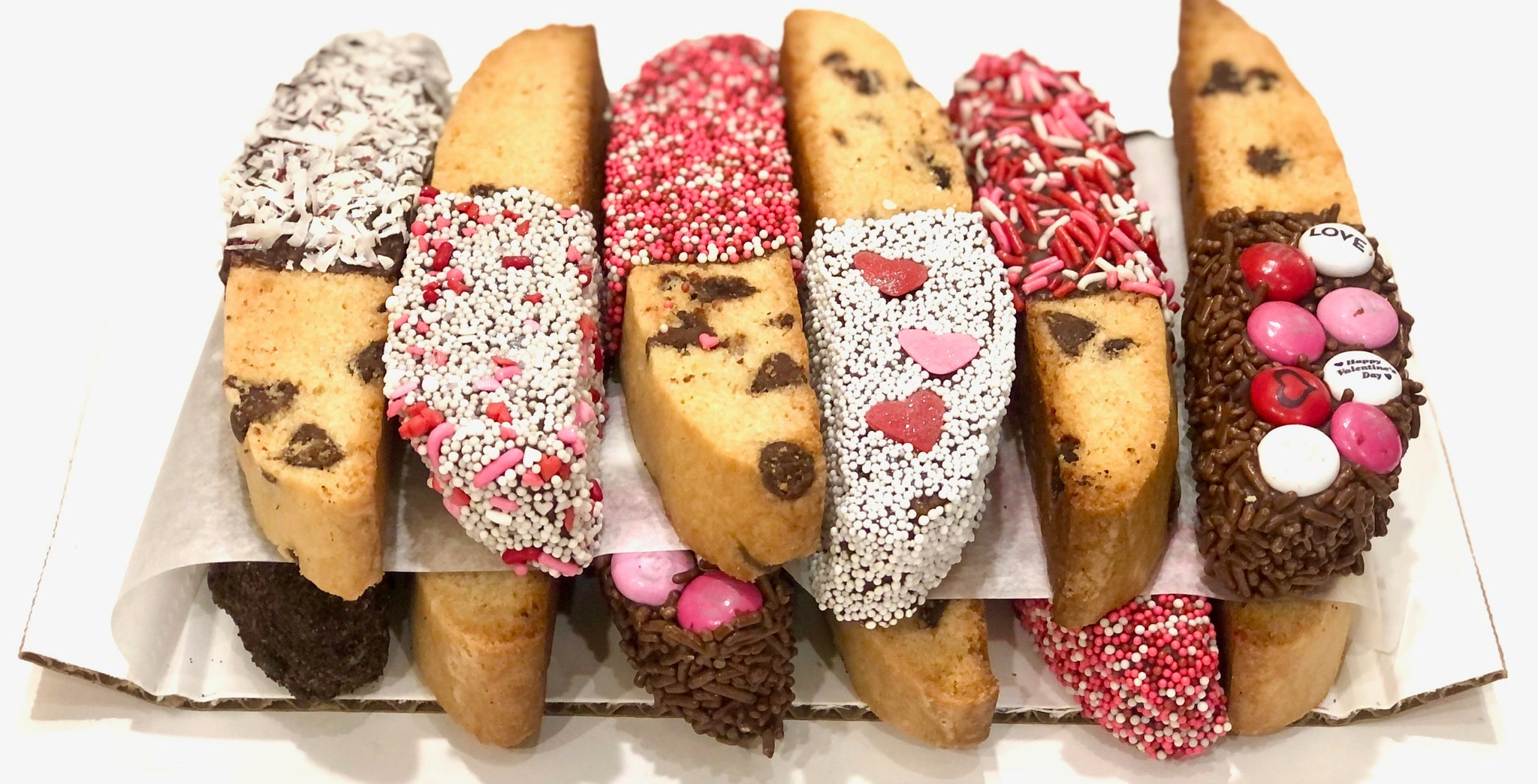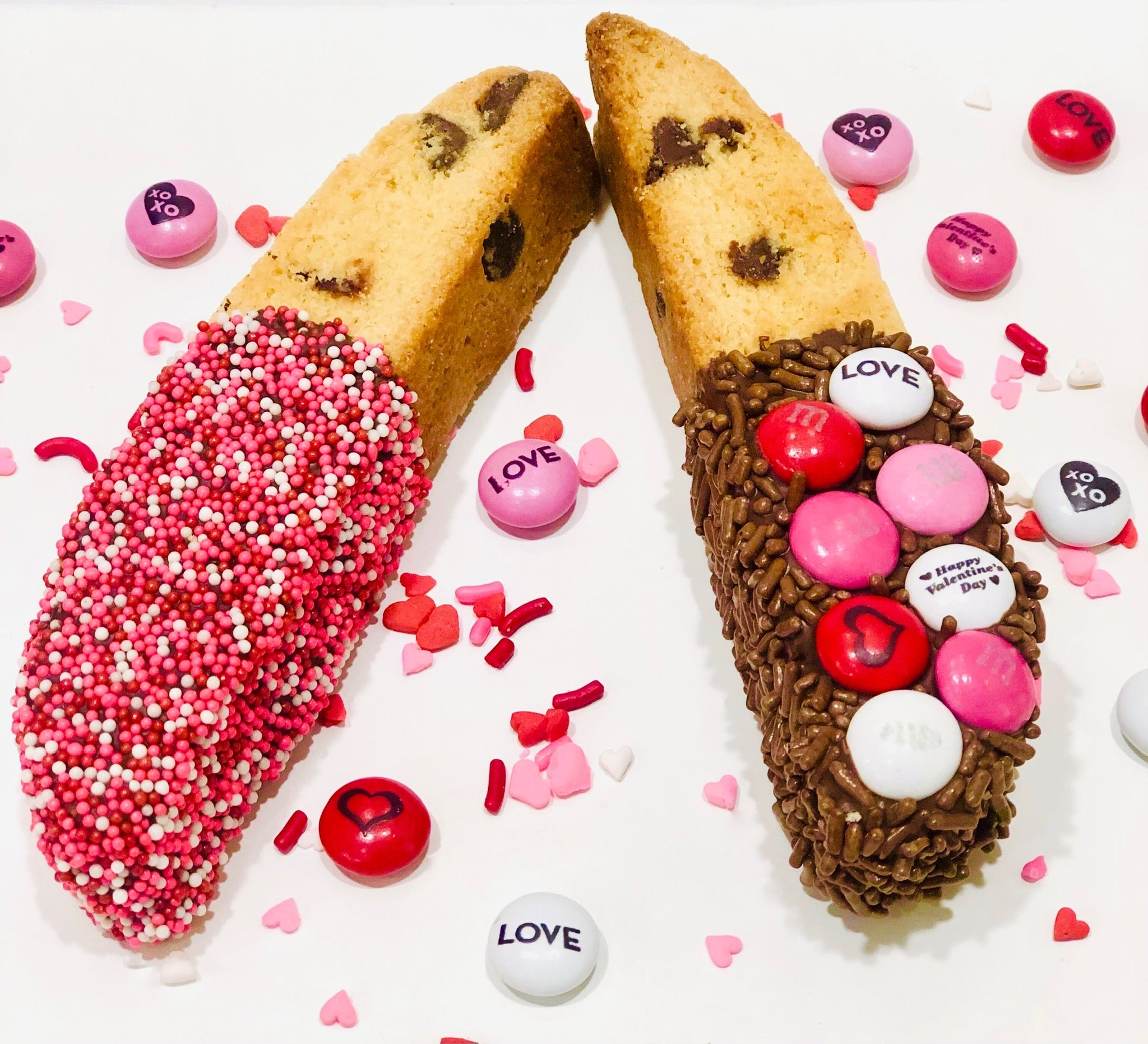 Signature chocolate chip biscotti dipped in decadent rich chocolate and decorated for your TRUE LOVE for Valentines Day!